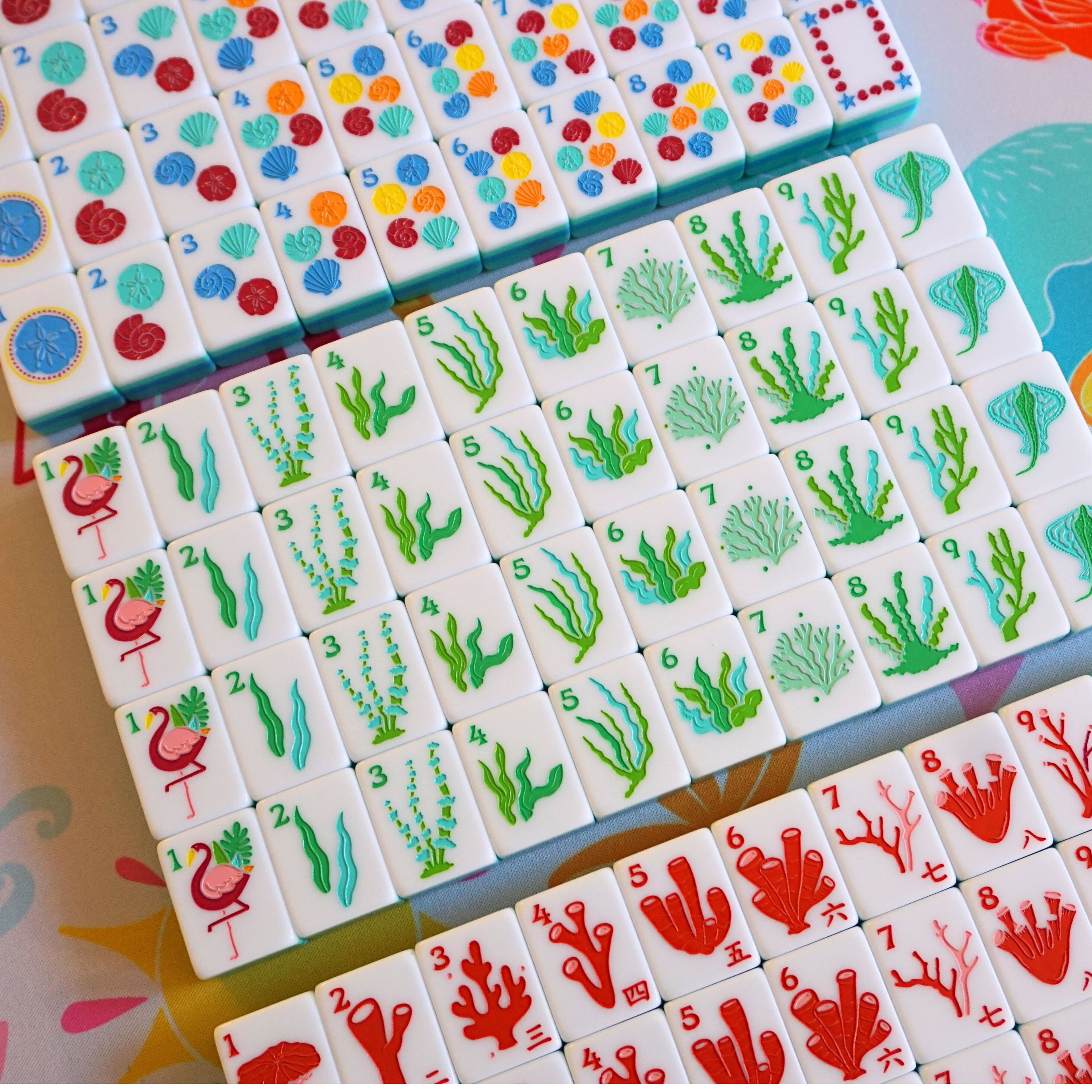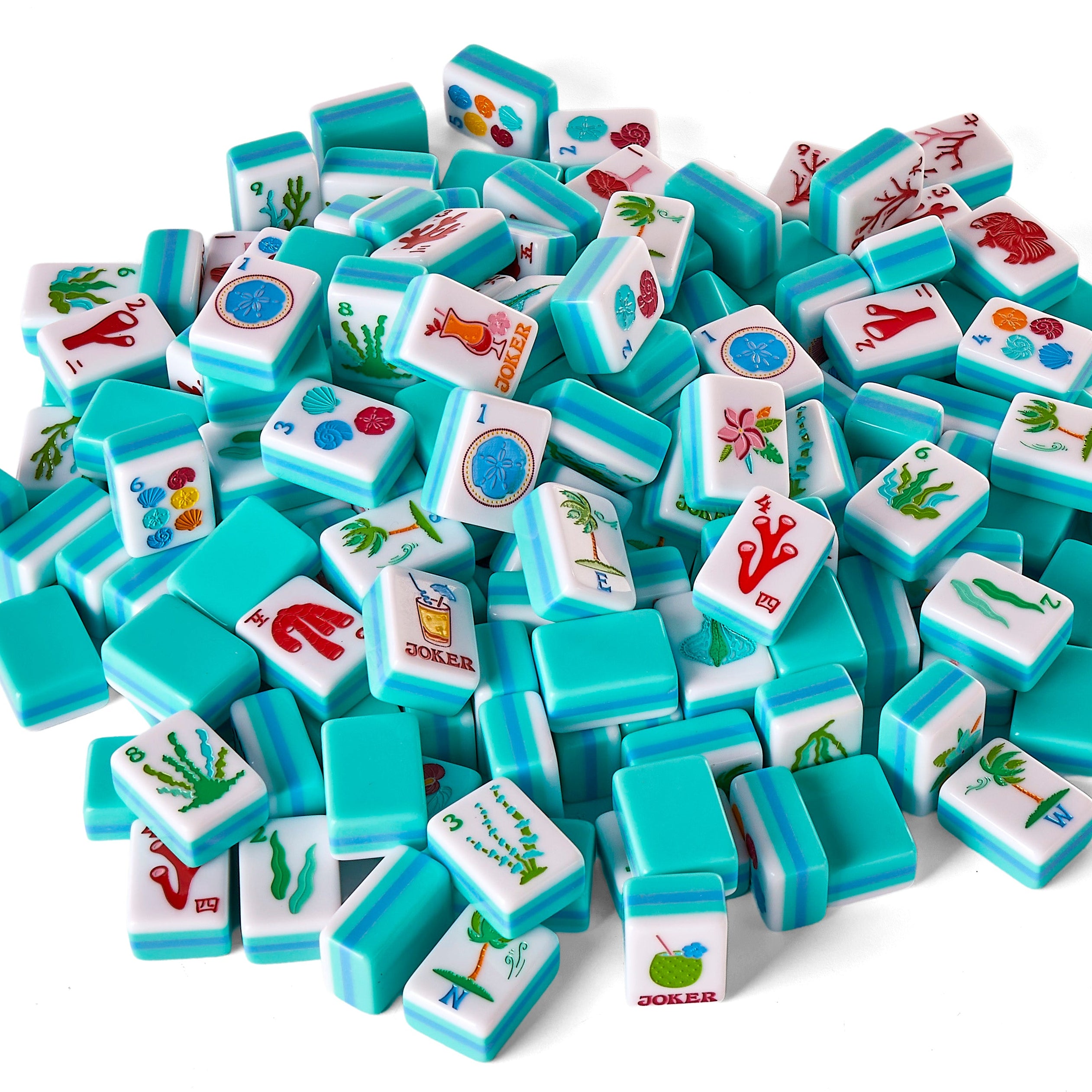 Inspired by a life by the sea and winter escapes to the Caribbean, the Island Mahjong Set captures the bright, playful spirit of tropical living. With flamingos, sea grass, coral craks, and seashell dots, each tile is a nod to turquoise waters, breezy palms, and the kind of days where the drinks come with umbrellas and shoes are optional. This set is designed to bring vacation energy straight to your game night—whether you're poolside, beachfront, or just dreaming of your next getaway.